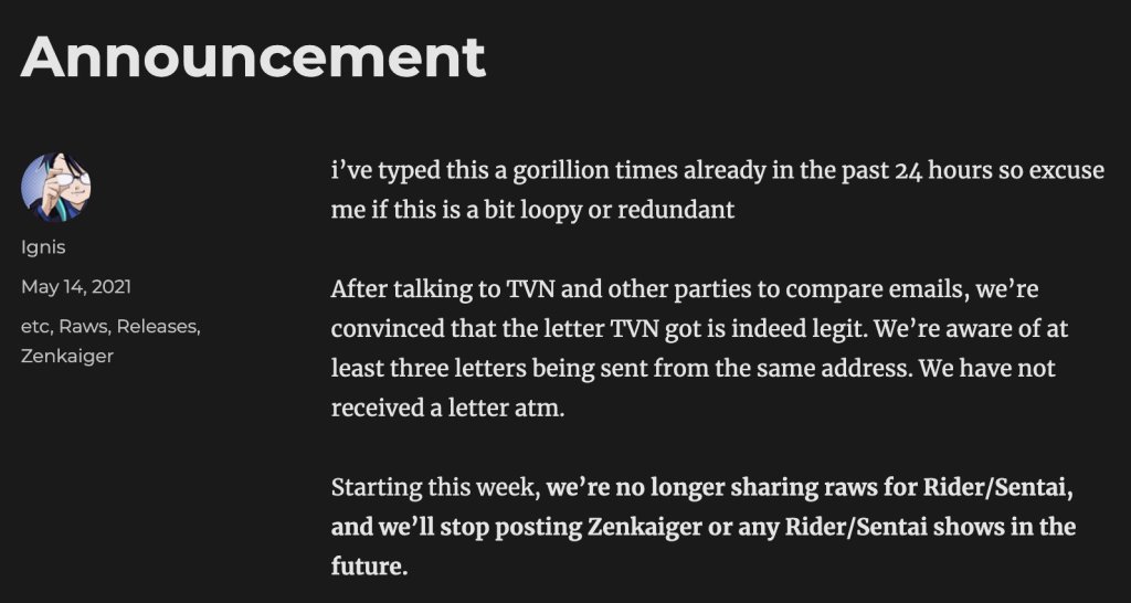 A fansub americana TV Nihon foi notificada pela Toei na semana passada, por disponibilizar episódios de várias séries Kamen Rider e Super Sentai nos últimos anos. Com isso, vários países poderão ficar sem assistir Kamen Rider Saber e Zenkaiger a partir desta semana, isso por meios alternativos.