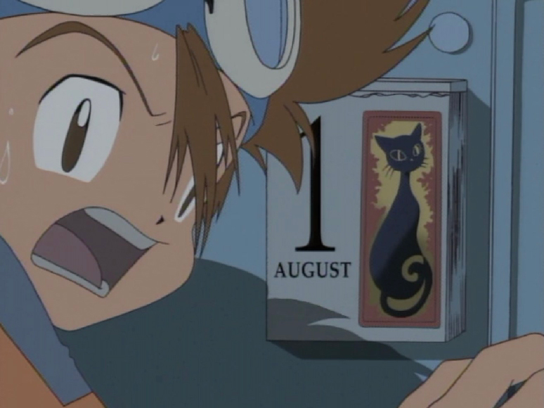 O primeiro episódio foi ao ar em 7 de março de 1999 pela Fuji TV. A menção ao dia ficou mais evidente no episódio 21, intitulado no Brasil como Temporariamente em Casa, exibido coincidentemente no Japão em 1º de agosto de 1999, uma manhã de domingo. Foi quando Tai, junto com Agumon, voltou para Odaiba, passou um tempo cuidando de Kari, sua irmã mais nova, e teve que retornar ao Digimundo. A passagem de dias no mundo digital equivalia a minutos na Terra.